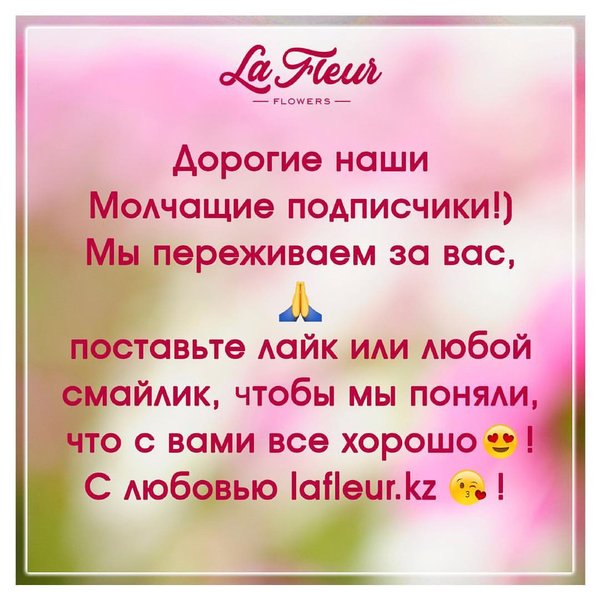 Дорогие наши, молчащие подписчики!) Мы переживаем за вас, поставьте лайк ️ или любой смайлик, чтобы мы поняли, что с вами все хорошо! С любовью lafleur.kz