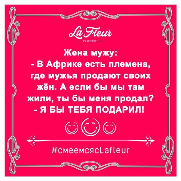 Жена говорит мужу: — в Африке есть племена, где мужья продают своих жен. А если бы мы там жили, ты бы меня продал? — Я бы тебя подарил! … ️Ставьте лайк ️, отмечайте своих друзей в комментариях снизу …