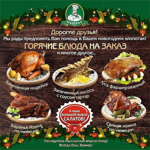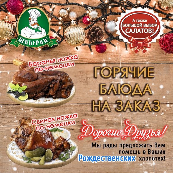Друзья! Совсем скоро главный праздник года. Удивите своих родных и друзей, вкусными и не обычными блюдами. Помогут Вам заполнить праздничный стол кулинары Беккера. Принимаем заказы на фирменные горячие блюда. А так же выпечку пирогов по Вашему желанию, любого размера и веса. Заказывайте у менеджеров в сети супермаркетов «Беккер и К»