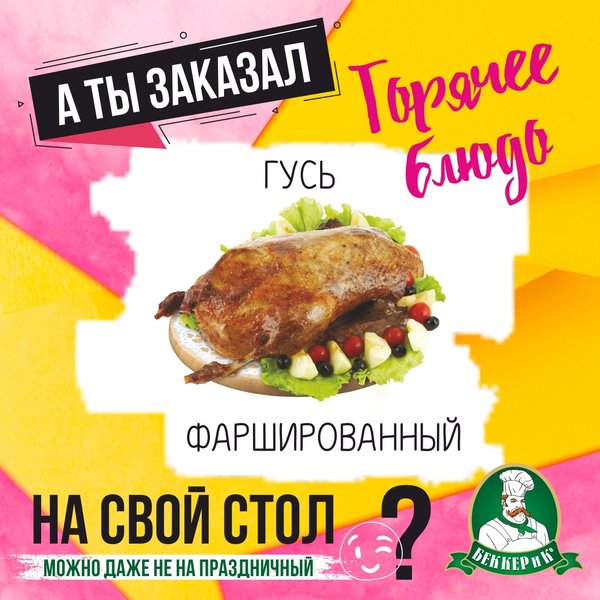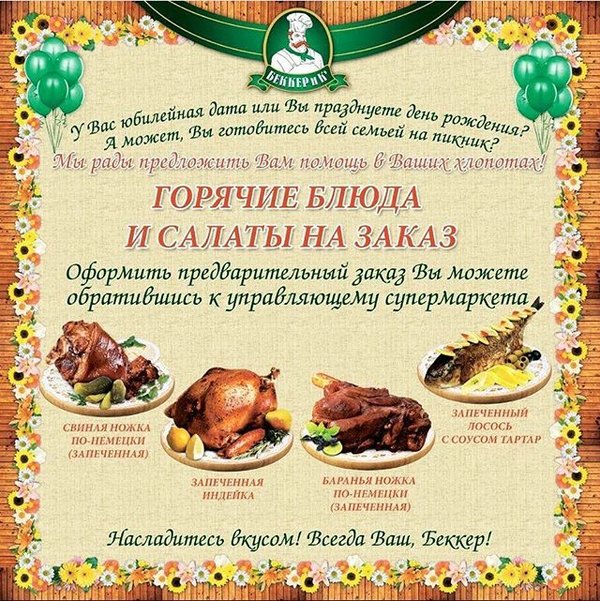 Друзья, хотим напомнить Вам, что компания «Беккер и К» принимает заказы на ассортимент фирменных горячих блюд, салаты, выпечка и торты лучший помощник Вам. Удивите своих родных и друзей, вкусными и не обычными блюдами. Помогут Вам заполнить праздничный стол кулинары Беккера. Принимаем заказы на фирменные горячие блюда. Заказы принимаются заранее у менеджеров с сети супермаркетов «Беккер и К».