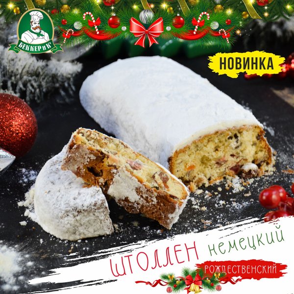 Представляем Вашему вниманию НОВИНКУ от Компании «Беккер и К»! Штоллен — традиционная немецкая рождественская выпечка из дрожжевого теста с добавлением изюма, цукатов и орехов (миндаль, грецкие). Сверху посыпан сахарной пудрой, напоминающий зимний белый снежок. А вкусный аромат ванили и лимона дополняет картину и создаёт атмосферу приближающегося Нового Года!