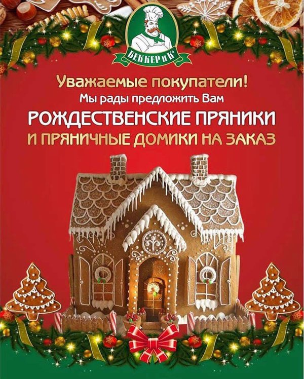 Вот такие замечательные пряничные домики, выполняем на заказ. Украсьте свой праздничный стол, вкусностями от Беккера. Создайте сказочную атмосферу в новогоднюю ночь. Заказы принимаются у менеджеров в сети супермаркетов «Беккер и К» Хорошего дня и приятного аппетита