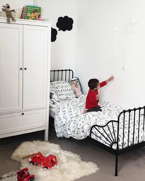ределить каждому чаду свое место для хранения. Придать индивидуальность пространству, которое принадлежит каждому ребенку, чтобы он чувствовал, что этот уголок с кроватью, ящиками и полочками только его. В комнате обязательно должно быть общее пространство, так сказать нейтральная территория. Пусть это будет просто коврик, но дети должны понимать, что он общий. У кого двое детей ? Как вы справились с этой задачей? На фото (взятое в просторах интернета, спасибо автору) видно, что комната выполнена в нейтральных тонах и, в общем, отвечает вышеупомянутым принципам. Выдвижная кровать Флакса вышла из ассортимента, есть другая — Слэкт.
