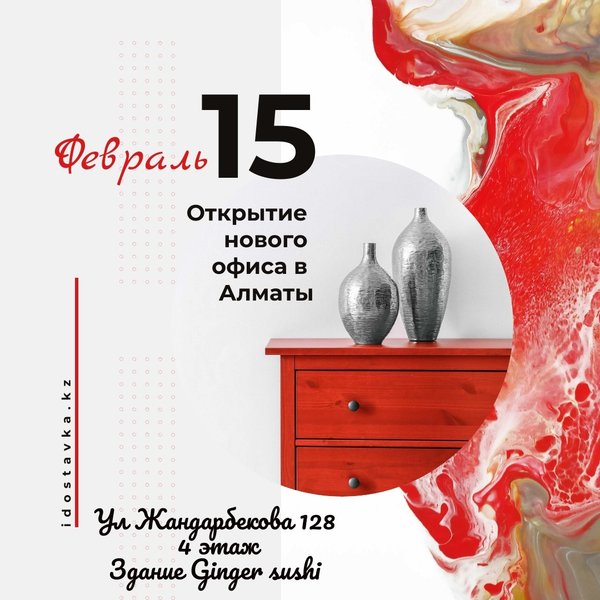 Доброго дня, друзья! Мы рады анонсировать прекрасное событие 15 февраля компания iDostavka.kz открывает свой новый офис в Алматы! Он будет расположен по адресу ул. Жандарбекова 128, 4 этаж здание Ginger sushi Будем ждать Вас каждый день: пн-пт с 9:00 до 21:00 сб, вск с 10:00 до 21:00