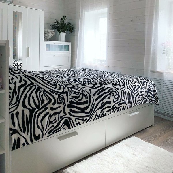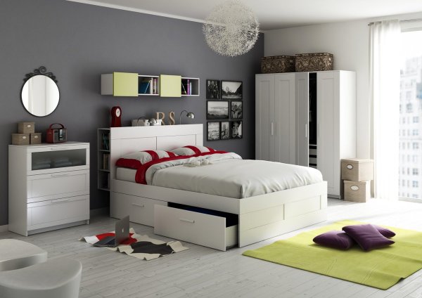 Эта спальня обставлена мебелью ИКЕА из серии Бримнэс. Эта серия отличается низкими ценами (например, комод стоит всего 3 999 руб) и прочностью.