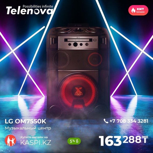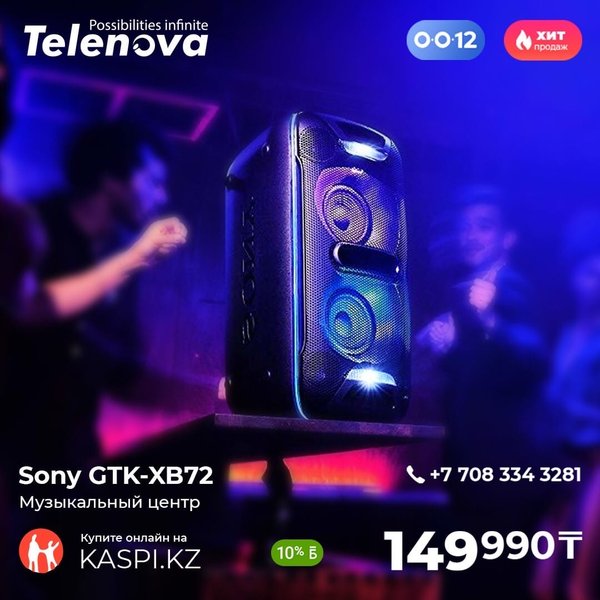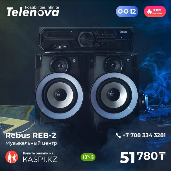 ройства непосредственно с телефона. ЯРКАЯ СВЕТОВАЯ ПОДСВЕТКА Клубная атмосфера на любой вечеринке благодаря нескольким режимам подсветки. Дизайн с диджейскими вертушками Дизайн с диджейскими вертушками для удобства управления файлами. Общая мощность 1000W Фронтальные колонки 500W Сабвуфер 500W Проходите в Каспи Магазин, выбирайте Telenova и оформляйте покупку не выходя из дома! У нас самые низкие цены! Доставка по всему Казахстану. Алматы, ТЦ МЕРЕЙ, пр. Суюнбая 2, к. 10, ⠀ Шымкент, ул. Тауке хана 63, Нур-Султан, ул. Шевченко 10/1,