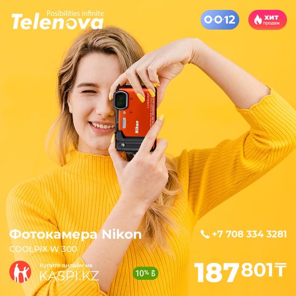 рые расскажут о вашем путешествии. Увлекаетесь дайвингом? Возьмите с собой фотокамеру COOLPIX W300, которая позволяет делать фотографии и записывать видеоролики на глубине до 30 м без специального бокса.¹ Эта пыленепроницаемая компактная фотокамера не подведет и на суше: она снимает при низкой температуре до −10 °C², а ее ударопрочный корпус выдерживает падения с высоты до 2,4 м.³ Совершайте погружения на открытой воде, чтобы получить сертификат Advanced Open Water, отправляйтесь в самые сложные походы, спускайтесь на лыжах с горных склонов — и не беспокойтесь о сохранности фотокамеры. Сочетание светосильного широкоугольного зум-объектива NIKKOR и КМОП-матрицы с разрешением 16 мегапикселей позволяет получать превосходные изображения незабываемых моментов даже при слабом освещении. Проходите в Каспи Магазин, выбирайте Telenova и оформляйте покупку не выходя из дома! У нас самые низкие цены! Доставка по всему Казахстану. ️ Алматы, ТЦ МЕРЕЙ, пр. Суюнбая 2, к. 10, ⠀ Шымкент, ул. Тауке хана 63, Нур-Султан, ул. Шевченко 10/1,