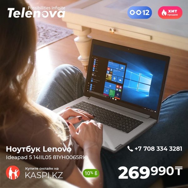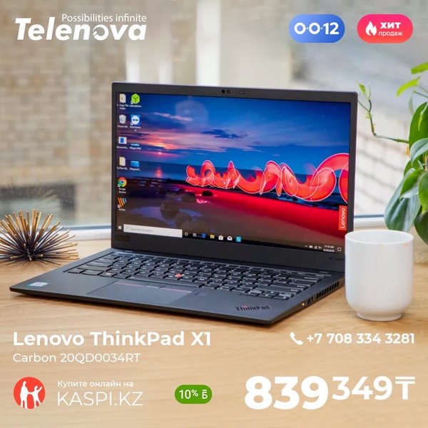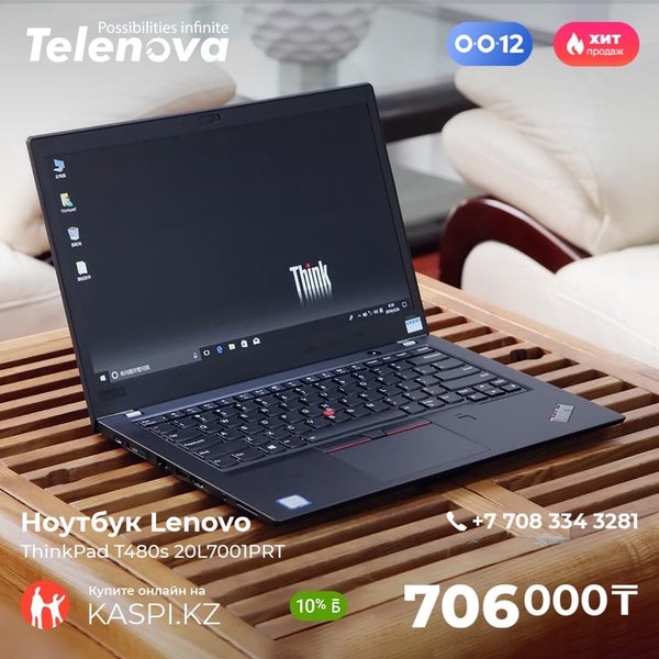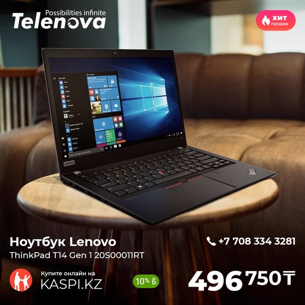 я работы, так и для развлечений в нерабочее время. Получить яркие впечатления от просмотра видео поможет широкоугольный дисплей стандарта Ultra HD со сверхвысоким разрешением 4K и поддержкой технологии Dolby Vision™. Благодаря аудиосистеме Dolby Audio™ с улучшенным звуком просмотр фильмов и прослушивание музыки подарят вам незабываемые впечатления. Долговечность = эффективность Мы протестировали ноутбук ThinkPad T14 на соответствие требованиям 12 военных стандартов, а также выполнили более 200 проверок качества его работы в экстремальных условиях. На этот ноутбук можно положиться в арктической глуши и во время пыльной бури в пустыне, в условиях невесомости и под проливным дождем. С Wi-Fi или без С ноутбуком T14 вы будете на связи везде. Выбрав опцию WWAN с картой LTE-A, вы сможете подключаться к интернету в зоне обслуживания любого оператора мобильной связи*. Теперь можно не беспокоиться о наличии и радиусе действия сетей Wi-Fi. Проходите в Каспи Магазин, выбирайте Telenova и оформляйте покупку не выходя из дома! У нас самые низкие цены! Доставка по всему Казахстану. Алматы, ТЦ МЕРЕЙ, пр. Суюнбая 2, к. 10, ⠀ Шымкент, ул. Тауке хана 63, Нур-Султан, ул. Шевченко 10/1,