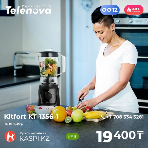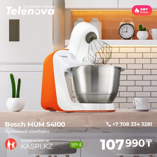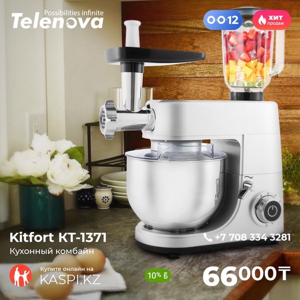 ладкой поверхности. Насадки можно мыть в п/м машине Плавный пуск Автоматическая парковка: насадки останавливаются в положении, удобном для их извлечения Материал / Дизайн Чаша из нержавеющей стали, объем 3.9 л Аксессуары в комплекте Крюк для теста, венчик для жидкого теста, венчик для взбивания сумка для хранения насадок Прозрачная крышка с загрузочным отверстием Интерактивный DVD диск с рецептами блюд Безопасность Резиновые ножки-присоски Высочайший стандарт безопасности благодаря защите от перегрузки Защита от повторного включения Проходите в Каспи Магазин, выбирайте Telenova и оформляйте покупку не выходя из дома! У нас самые низкие цены! Доставка по всему Казахстану. Алматы, ТЦ МЕРЕЙ, пр. Суюнбая 2, к. 10, ⠀ Шымкент, ул. Тауке хана 63, Нур-Султан, ул. Шевченко 10/1, комбайн