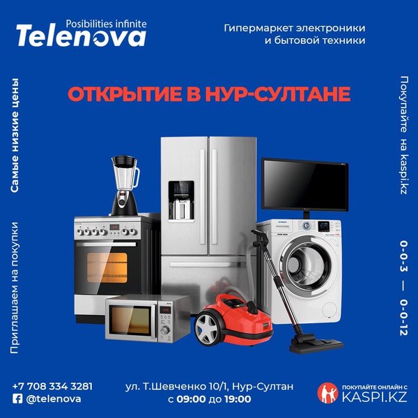 н, выбирайте Telenova и оформляйте покупку не выходя из дома! У нас самые низкие цены! Доставка по всему Казахстану. ️ Алматы, ТЦ МЕРЕЙ, пр. Суюнбая 2, к. 4, ⠀ Шымкент, ул. Тауке хана 63, Нур-Султан, ул. Шевченко 10/1,