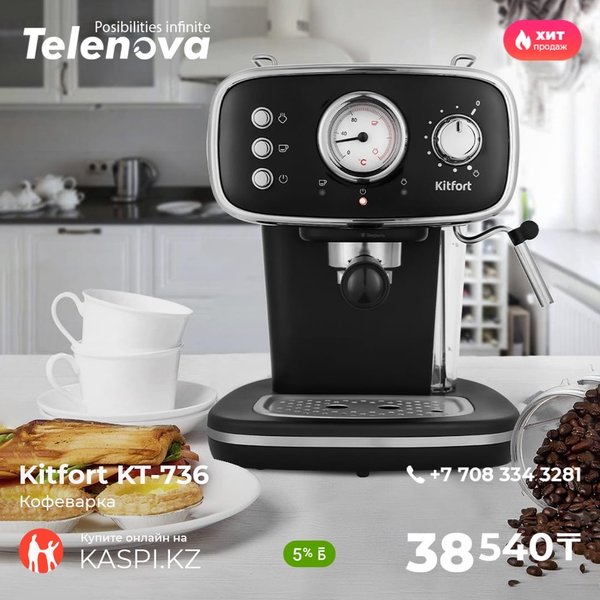 управления имеются все необходимые кнопки для работы, а также регулятор подачи пара. Термометр отображает приблизительную температуру бойлера. Хранение чашек Для хранения чашек сверху на кофеварке имеется специальная площадка. Теперь они всегда под рукой! Съёмный резервуар Резервуар для воды объёмом 1,2 л легко снимается и наполняется водой. Также его удобно чистить. Поддон для сбора капель Поддон для сбора капель с решёткой из нержавеющей стали легко снимается, моется и устанавливается обратно. В поддоне установлен красный поплавок. Если поддон заполнился водой, то поплавок всплывет выше решётки, это значит следует слить воду из поддона. Мерная ложка-темпер В комплекте к кофеварке идёт ложка-темпер. Темпер – незаменимый предмет в приготовлении кофе. Используется для утрамбовки молотого кофе и как мерная ложка. Проходите в Каспи Магазин, выбирайте Telenova и оформляйте покупку не выходя из дома! У нас самые низкие цены! Доставка по всему Казахстану. Алматы, ТЦ МЕРЕЙ, пр. Суюнбая 2, к. 10, ⠀ Шымкент, ул. Тауке хана 63, Нур-Султан, ул. Шевченко 10/1,