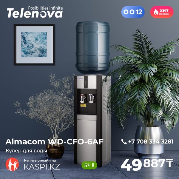 ую воду заданной температуры независимо от температуры окружающей среды. Производительность нагрева кулера составляет – 5 л/ч (95°С), а производительность охлаждения – 2 л/ч (5—10°С). Проходите в Каспи Магазин, выбирайте Telenova и оформляйте покупку не выходя из дома! У нас самые низкие цены! Доставка по всему Казахстану. ️ Алматы, ТЦ МЕРЕЙ, пр. Суюнбая 2, к. 10, ⠀ Шымкент, ул. Тауке хана 63, Нур-Султан, ул. Шевченко 10/1,