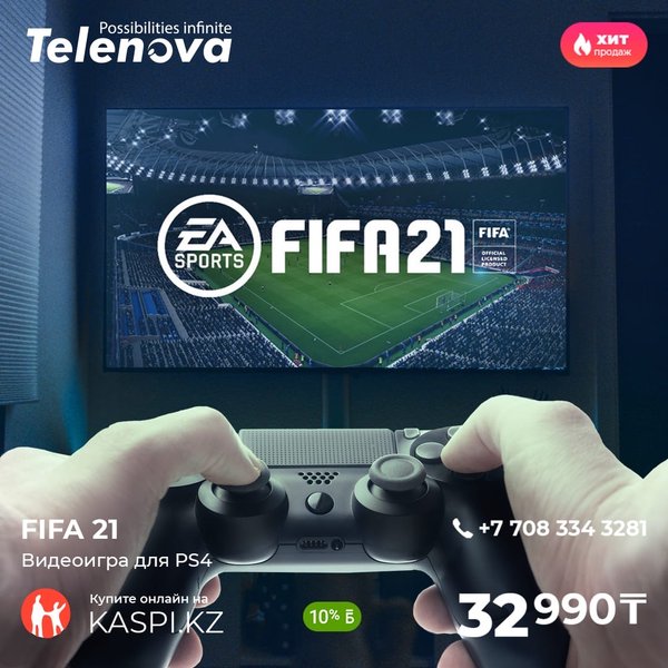 с друзьями, проходите кампанию игры и просто получайте удовольствие от FIFA 21!!! ️ Проходите в Каспи Магазин, выбирайте Telenova и оформляйте покупку не выходя из дома! У нас самые низкие цены! Доставка по всему Казахстану. ️ Алматы, ТЦ МЕРЕЙ, пр. Суюнбая 2, к. 10, ⠀ Шымкент, ул. Тауке хана 63, Нур-Султан, ул. Шевченко 10/1,