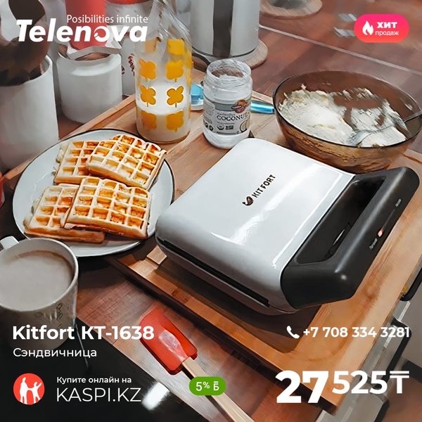 Электрическая вафельница-бутербродница Kitfort KT-1638 поможет испечь венские и бельгийские вафли, а также запечь бутерброды. Она оснащена световыми индикаторами включения и нагрева, независимыми нагревателями в каждой половинке формы, противоскользящими ножками и отсеком для хранения шнура. Внутреннее покрытие антипригарное Имеются две формы для готовки: Пластины для бутербродов и Пластины для вафель Проходите в Каспи Магазин, выбирайте Telenova и оформляйте покупку не выходя из дома! У нас самые низкие цены! Доставка по всему Казахстану. ️… — Читать дальше