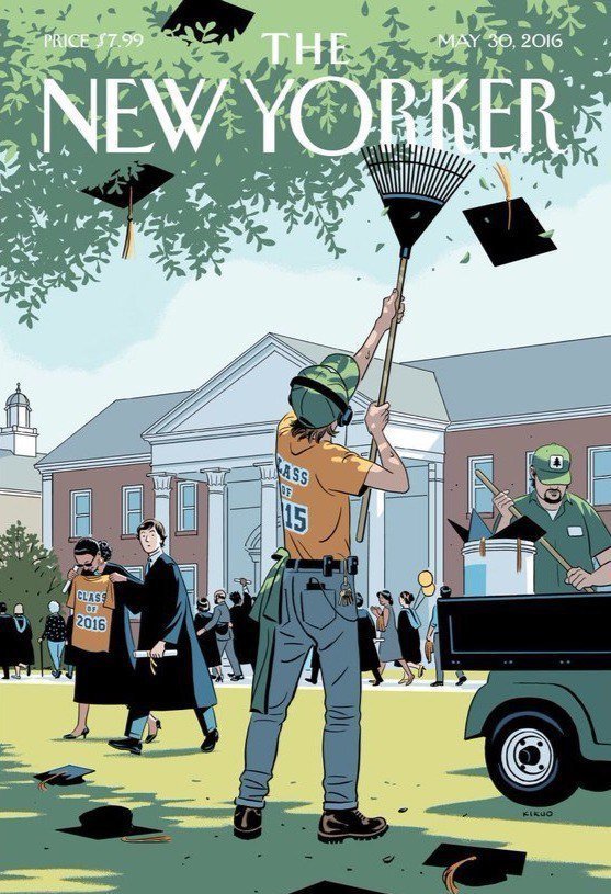 The New Yorker презентовал обложку номера, который поступит в продажу 30 мая. Рисунок на ней привлёк внимание пользователей сети своей «беспощадностью»: на нём изображён выпускник 2015 года, который, работая уборщиком, стряхивает с дерева шапки выпускников 2016 года.