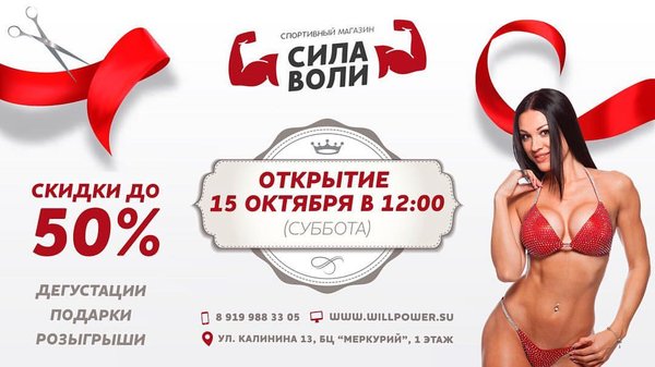 Анастасия Ерёмина-Юрова (13.10.2016): Друзья,хочу пригласить Вас на открытие Магазина «Сила Воли«Вас Ждёт множество сюрпризовСкидки до 50%Дегустация Спортивного питанияКонкурсыОтличное времяпровождение мы гарантируем Калинина 13 Бизнес Центр Меркурий
