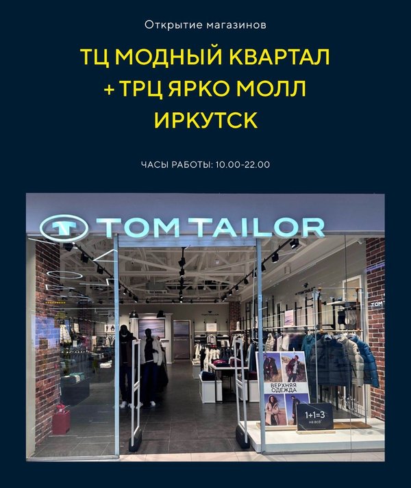 Иркутск, встречай! Сразу два магазина Tom Tailor в вашем городе! Мы растем и стараемся быть ближе к каждому своему покупателю.