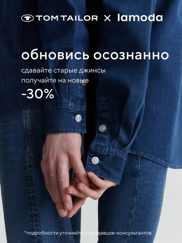 ся и после. Приглашаем вас стать частью цикла моды вместе с Tom Tailor и Lamoda и принять участие в нашей акции. Она действует до 31 октября. Сдав старые джинсовые вещи в специальный экобокс в магазинах Tom Tailor (ищите адреса 15 фирменных магазинов, участвующих в акции, на сайте), вы получаете промокод на 30% скидку на покупку новых джинсов.