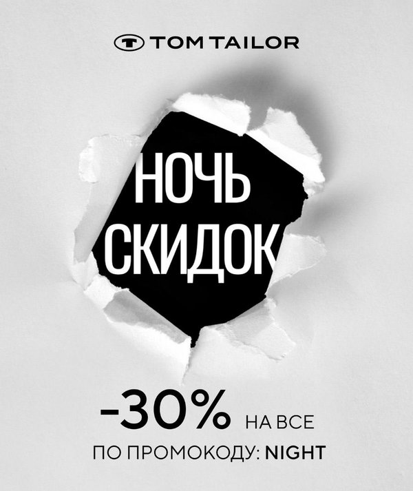 Только сегодня и только онлайн вас ждет самая невероятная ночь в году, когда все цены на сайте и в приложении Tom Tailor становятся ниже! Готовьте свои корзины заранее, внимательно следите за обновлениями и не пропустите старт страшно модной и ужасно классной акции.