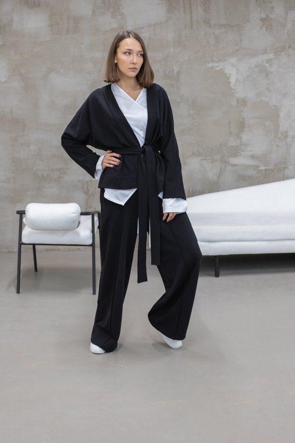Жакет-кимоно — это смесь удобства и элегантности. Приталенный крой позволит вам сочетать его с классическими образами, а мягкая трикотажная ткань не будет стеснять движений и «подружит» его с луками в спортивном стиле. Стоимость — 18700 тенге. В наличии в молочном и черном цвете.