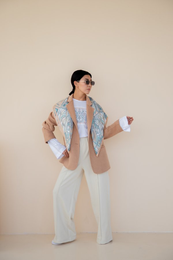 Аксессуары в луках в стиле минимализм становятся глотком свежего воздуха. Они разбавляют монохромные сочтания и «цепляют» взгляд. Именно яркий платок в образе на фото делает его самобытным и запоминающимся. На модели: брюки (твилл) 21900 тенге, накидка (лен/хлопок) 36000 тенге, платок (шелк) 27690 тенге.