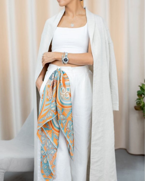 Платок – это очень многогранный аксессуар, в каком бы стиле ни был ваш гардероб, ему всегда найдется там место. Шёлковый платок в придает образу утонченность, ведь шелк – это роскошный материал. Каждая девушка заслуживает того, чтобы в ее ящике с аксессуарами был хотя бы один качественный платок, например такой, как платок «Павлин» от Адили размером 90*90 см. Стоимость 27690 тенге.