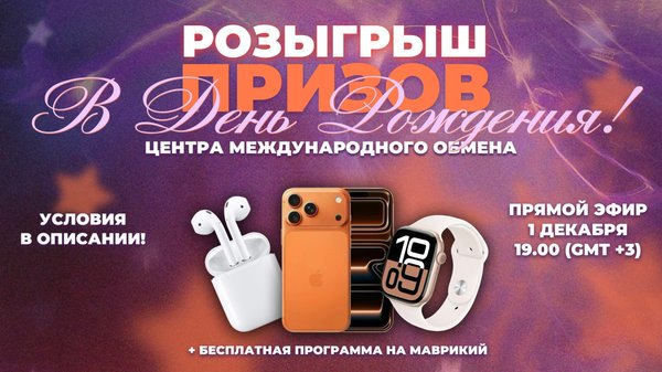 В честь дня рождения Центра Международного Обмена на нашем YouTube-канале состоится премьера новых видео, посвященных программам международного обмена! В честь праздника мы проведем праздничный розыгрыш в прямом эфире! Чтобы принять участие и получить шанс выиграть один из ценных призов, выполните три простых шага! ПРИЗЫ 1. IPHONE 17 2. ЧАСЫ APPLE WATCH 3. НАУШНИКИ AIRPODS Розыгрыш призов состоится 1 декабря в 19.00 (GMT+3) в прямом эфире. Чтобы принять участие и получить шанс выиграть один из ценных призов, выполните три простых шага! УСЛОВ… — Читать дальше