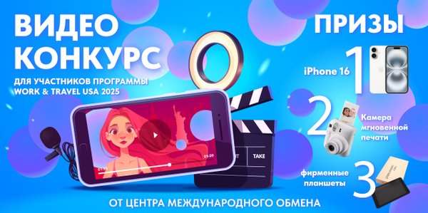Всем привет! Напоминаем все участникам Work and Travel USA, что вы можете поучаствовать в нашем видео-конкурсе, поделитесь своими приключениями и выигрывайте классные призы! ️iPhone 16 ️Камера мгновенной печати ️Планшеты Подробные условия участия в видео конкурсе () Победителей мы объявим 15 декабря! ️ Все участники должны выслать видео в хорошем качестве на @iec_videocontest ▶Видео, которые уже участвуют в конкурсе тут () Центр Международного Обмена Узнай подробнее о программе Work & Travel USA здесь! () Запишись на бесплатную консу… — Читать дальше