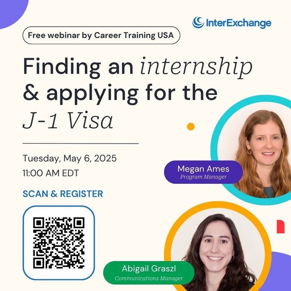 Наш спонсор InterExchange проводит бесплатный вебинар, посвященный программе стажировки в США! Тема вебинара: Как найти стажировку в США и подать заявку на визу J-1 Когда: Вторник, 6 мая, в 18:00 по МСК Что будет на вебинаре: • Советы по поиску стажировки в Америке • Советы от экспертов InterExchange • Ответы на ваши вопросы Регистрация: Сканируйте QR-код на изображении или переходите по ссылке, чтобы зарегистрироваться: Не упустите возможность узнать все о стажировке в США!