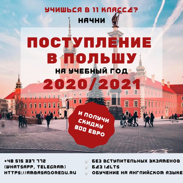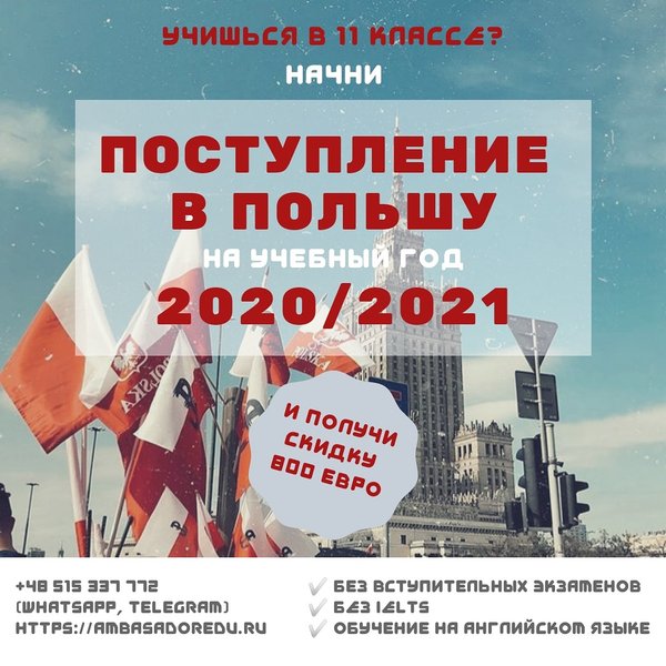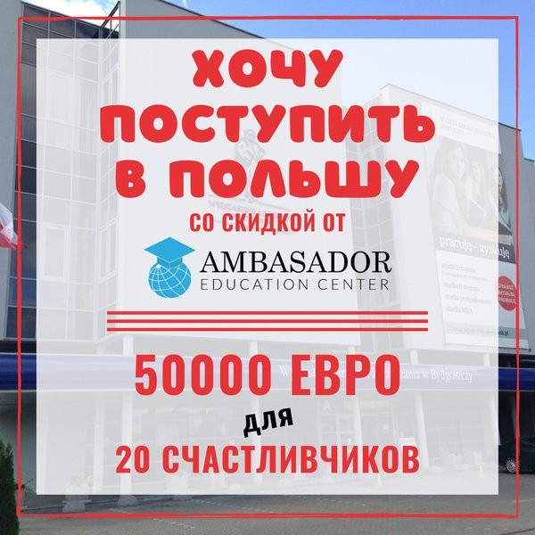 Лучшие университеты Польши теперь у нас! Образовательный центр AMBASADOR сообщает Вам о масштабном расширении предложения. Целых 16 новых партнёров! 16 государственных университетов Польши, входящих в мировой рейтинг QS World Ranking TOP-1000. Богатый выбор факультетов и специальностей на английском языке. Гуманитарные, технические и естественные направления по доступным ценам. Прием документов уже начался! Больше информации: WhatsApp, Telegram)