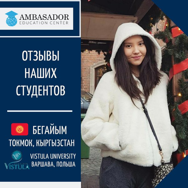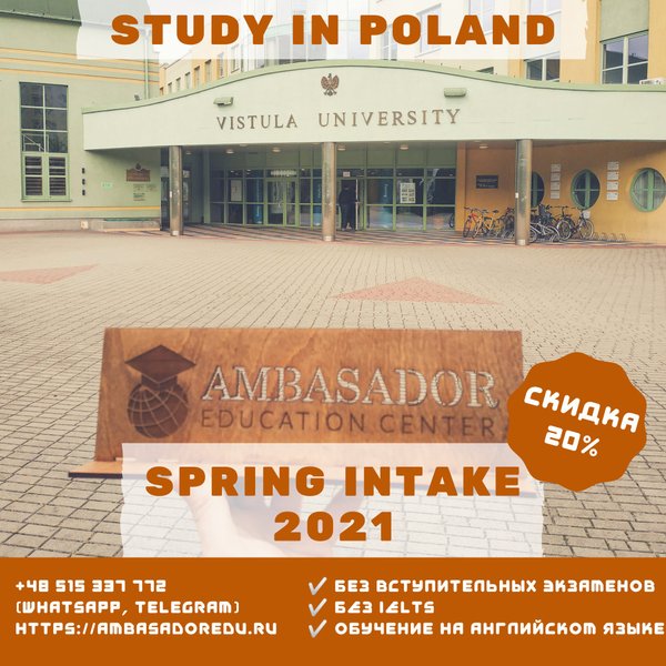 вательного центра Ambasador. Зашла на их сайт, заполнила анкету. За короткий промежуток времени со мной связался Никита, предложил варианты университетов и имеющиеся в них направления. Выбрала университет Vistula, специальность менеджмент. Дальше начался процесс поступления, который никаких сложностей не составил. Со всеми вопросами обращалась к Никите. Он также полностью помог процессом получения визы в консульстве. Поступала я на зимний семестр, но по личным обстоятельствам учебу пришлось перенести на летний. В связи с этим, я проходила онлайн интервью, которое прошло успешно. Наконец-то прилетев Варшаву, встретилась в университете с Никитой, где он помогал мне с подачей документов. Также мне помогли в получении нострификации. В связи с введением режима эпидемии, мы перешли на онлайн обучение и к сожалению традиционная учеба в университете для меня длилась всего полторы недели. Но могу сказать, что университет оказался лучше, чем я ожидала и мне понравилось большинство преподавателей. Vistula является самым международным университетом в Польше по процентным показателям, что открывает возможность познакомиться не только с польской культурой, а также с культурами других разных стран, откуда прилетают учащиеся в ней студенты. На факультете Менеджмента учиться совсем не трудно. Расписание довольно-таки свободное и в силу этого желающим легко можно найти подработку. Есть ещё несколько моментов, которые меня порадовали: в университете можно выбрать себе определённую секцию или вид спорта для прохождения физкультуры из примерно пяти предложенных вариантов или можно предъявить свой абонемент со спортзала и вовсе не регистрировать этот курс. При наличии сертификатов TOEFL или IELTS или при сдаче теста в университете, набрав достаточное количество баллов, можно выбрать для изучения иностранный язык, где также предлагаются около 5 вариантов, и определившись с выбором, я решила начать изучать испанский. Моя студенческая жизнь в Польше началась довольно интересно, и я надеюсь ее продолжение для меня будет ещё более интересным.