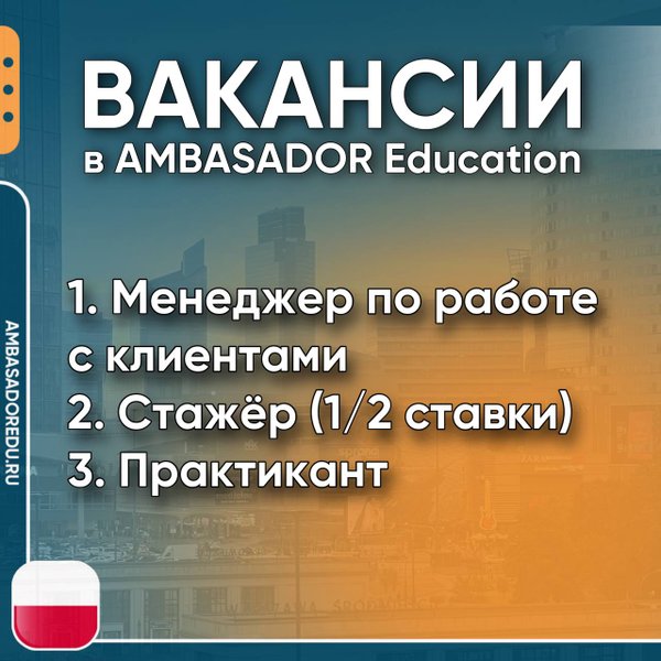 ентов; — оперативная работа по благоустройству клиентов; — налаживание и поддержание отношений с университетами; — поиск потенциальных клиентов; — организация мероприятий, связанных со сферой деятельности. Что мы предлагаем? — динамичная (не скучная) работа в офисе и вне его; — развитие навыков общения и функционирования в международной среде; — гибкий (но плотный) график работы; — возможность совмещать с учебой; — достойный уровень дохода; — возможность реализовать свои лучшие качества и идеи! Обязательные навыки: — свободное знание английского языка (В2-С1); — свободное знание русского языка; — разговорный уровень польского языка (А2-В1); — место проживания Варшава; — коммуникабельность; — ответственность; — готовность к нестабильному графику работы (в том числе выходные дни); — умение работать с большим количеством информации; — внимательность в оформлении документов. Желаемые навыки: — знание основ визового процесса; — знание основ процесса оформления вида на жительство; — знание основных правил заключения договоров; — знание специфики поступления в университет; — приветствуются свежие выпускники и студенты последних лет обучения. Чувствуешь, что ты именно тот избранный? Присылай своё резюме (CV) на office@ambasadoredu.ru (в теме указать: Account Manager). Мы ищем лучших, чтобы становиться лучше!