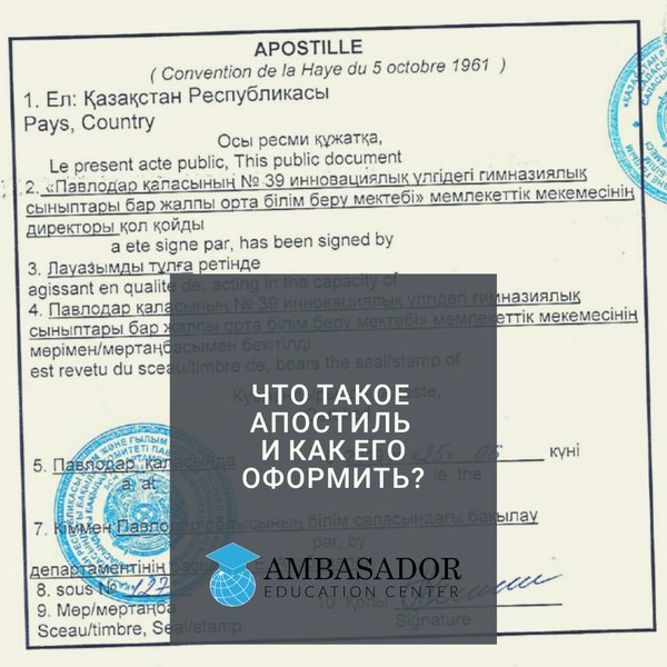необходимо ОБЯЗАТЕЛЬНО ставить на оригинал документа (аттестат, диплом колледжа, диплом лицея или диплом бакалавра). А уже после того, как на документ будет поставлен апостиль, его нужно переводить. Апостилирование документов – принятый в международном праве способ узаконить документы, выданные в одном государстве, для их правового использования в другом государстве. То есть без него документ попросту не будет иметь юридической силы в другой стране. Как выглядит этот апостиль? Апостиль это штамп, имеющий прямоугольную форму. Штамп должен иметь ряд пронумерованных пунктов и обязательное упоминание о Конвенции. Где можно оформить апостиль? Граждане Казахстана могут его оформить в ЦОНе. Граждане Кыргызстана могут оформить апостиль в Министерстве Юстиции. Граждане Таджикистана также могут оформить апостиль в Министерстве Юстиции. Граждане Узбекистана могут оформить апостиль в центре государственных услуг. Граждане России могут оформить апостиль в министерстве образования или департаменте образования.