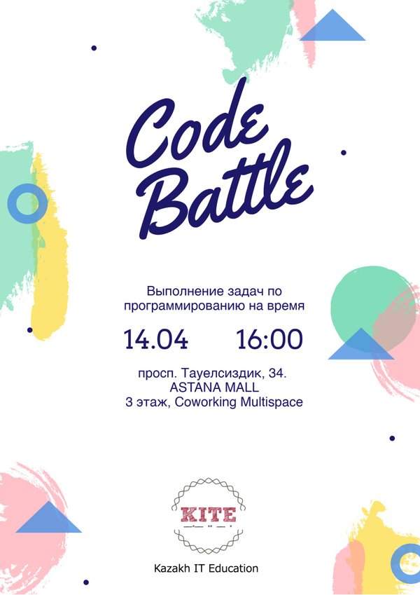 Впервые 14 апреля в 16 часов дня мы начнем Code Battle. Данное мероприятие проводится для улучшения навыков программирования. Так как мы проводим данный event впервые, приглашаются все желающие. Что из себя представляет Code Battle: — Решение задач по программированию на различных языках — Поддержка преподавателей, а также разбор решений задач — Приятная атмосфера, кофе, чай, знакомства Тел для справок:, Искандер