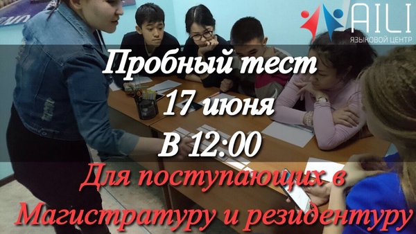 Дорогие друзья! Мы рады объявить что в эту субботу в 12:00 проводится бесплатный тест для поступающих в магистратуру, резидентуру, докторантуру и адъюнктуру по английскому языку. тест состоит из 100 вопросов просим регистрироваться по номеру whatsapp) места ограничены стоимость 0 тенге так же будет Speaking Club, начало в 14:00 Наш адрес: бизнес центр «М-10» улица Майлина 10, 216 офис