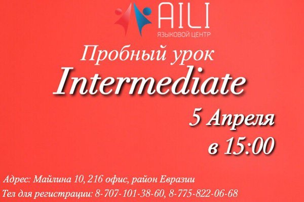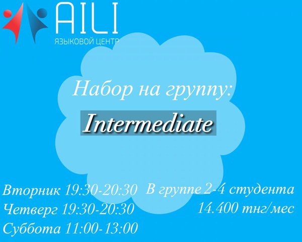 Дорогие друзья! Приглашаем Вас на пробный урок на уровень intermediate. Пробный урок бесплатный! Дальнейшее обучение 10.800 тнг/ 12 часов. В группе 4 студента! Осталось 2 свободных мест! Спешите записаться