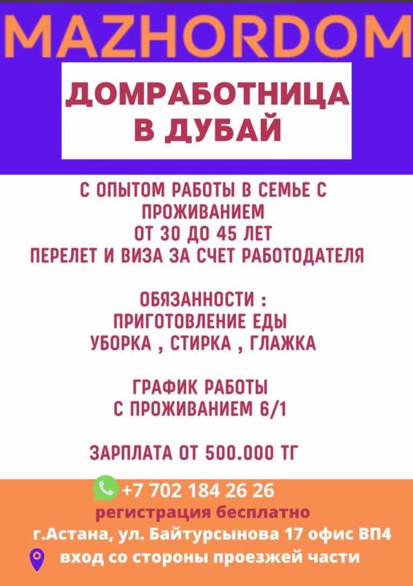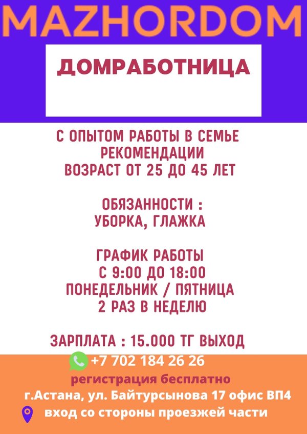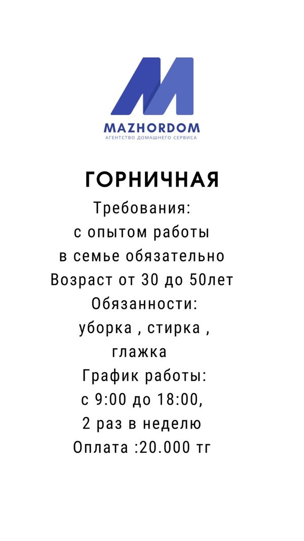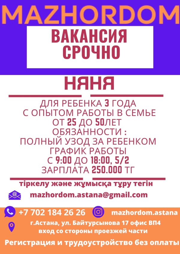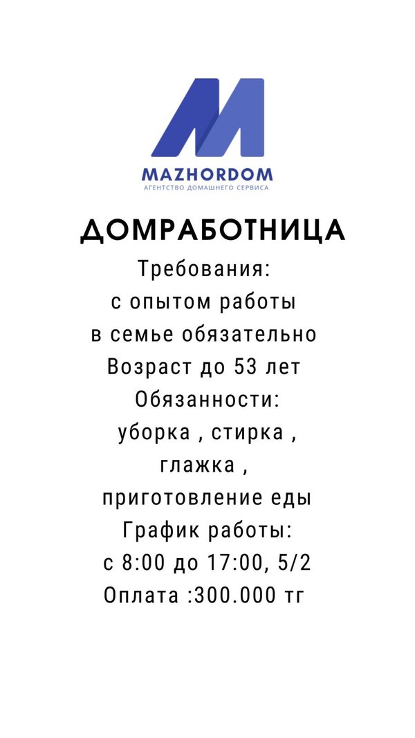 ти) Требования: опыт работы Обязанности: Полный уход ребенком, прогулки. кормление График работы: с 9—00 до 18—00, 5/2 Зарплата: 250.000 тенге ДОМРАБОТНИЦА (Коргальжинская трасса) Требования: опыт работы в семье Обязанности: Профессиональный уход за Гардеробом,Уборка, приготовление еды График работы: с 9—00 до 17—00, 5/2 Зарплата: 300.000—350.000 тенге НЯНЯ Требования: опыт работы не имеет значение Обязанности: Полный уход ребенком, прогулки. Уборка комнаты ребенка График работы: с 8—30 до 18—30, 5/2 Зарплата: 200.000—250.000 тенге ГОРНИЧНАЯ Требования: без опыта работы Обучение на месте Обязанности: Уборка Глажка, стирка График работы: с 9—00 до 18—00,5/2 Зарплата: 250 000 тенге ПРОФЕССИОНАЛЬНЫЙ ПОВАР Требования: с опытом работы в семье Обязанности: Приготовление еды Составление меню, Список продуктов закуп продуктов, сервировка стола ревизия холодильника Содержание кухни и кухонной техники в чистоте График работы: с 8—00 до 15—00,5/2 Зарплата: 400. 000—450.000 тенге ПОВАР ДОМАШНЯЯ КУХНЯ Требования: с опытом работы в семье Обязанности: Приготовление еды Составление меню, ревизия холодильника Содержание кухни и кухонной техники в чистоте График работы: с 9—00 до 18—00,5/2 Зарплата: 250 000 тенге ПОВАР Требования: с опытом работы в семье Знание правильного питания Обязанности:приготовление еды График работы: с 8—30 до 15—00, 2—3 раза в неделб Зарплата: выход 15.000—20.000 тенге НЯНЯ Требования: с опыта работы в семье Пед.образование обязательно, Опыт работы в детском саду Или развивающем центре желательно рекомендации Обязанности: Полный уход за ребенком Прогулки, сопровождение в бассейн, секции Развивающие занятия График работы: с 9—00 до 18—00,6/1 Зарплата: 400.000 тенге Все переработки доп.оплата Вакансии Агентства MAZHORDOM Регистрация бесплатно Трудоустройство только после регистрации Предварительную регистрацию и собеседование можно пройти при наличии удостоверения личности, в дальнейшем Вам надо предоставить: 1. Санитарную книжку 2. Справку о не судимости(ЦОН) 3. Справки нарко, псих, туб диспасер (ЦОН) 4. Фото 3*4 5. Сертификаты и дипломы по специализации для няни и гувернантки обязательно 6. Рекомендации если имеются ВСЕ О ВАКАНСИЯХ И КУРСАХ вы можете узнать в инстаграмм и тикток mazhordom.astana Наш адрес : г.Астана улСыганак 54 А офис 708/3 Бизнес центр А Прием с Понедельник по Пятницу с 10—00 до 15—00,5/2