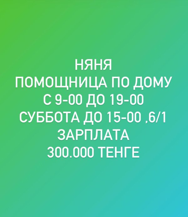 ости: Полный уход за ребенком Готовка, стирка, глажка. Ребёнок 2 года (с 8.30—13.00 и 15.00—16.00 ходить на занятий) График работы: 6/1 с 07.00—21.30 Вакцинирована Оклад: 200.000 тенге (отдельное квартира предоставляется) НЯНЯ-ПОМОЩНИЦА ПО ДОМУ Требования: опыт работы в семье Обязанности: Полный уход за ребенком Готовка 1 раз в день, уборка (120кв), стирка, глажка. Ребёнок 5лет (с 8.00 отводить в садик, забирать в 17.00) График работы: 6/1с 08.00—20.00. (субб. 9.00—14.00) Оклад: 250.000 тенге (с дальнейшем повышением) ***