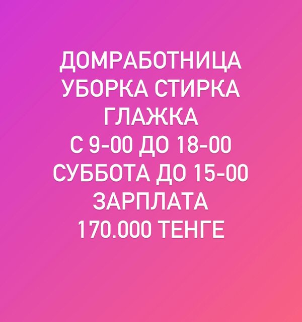куратная, ответственная Обязанности: Уборка (200 кв) глажка, стирка. График работы: 5/2 с 8—00 до 18—00 Зарплата: 200.000 тенге *** ДОМРАБОТНИЦА Требования: опыт работы в семье, чистоплотная, аккуратная, ответственная Обязанности: Уборка (500 кв) глажка, стирка. VIP гардероб График работы: 6/1 с 9—00 до 18—00 Зарплата: 280.000 тенге