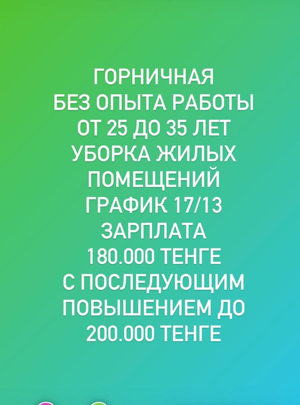 00,5/2 Утром развозка, официальное оформление Пенсионные отчисления Зарплата: 400. 000—450.000 тенге ******* НЯНЯ-ПОМОЩНИЦА ПО ДОМУ Требования: Опыт работы в семье Обязанности : Уход за ребенком 7 лет Сопровождение секции Уборка,Приготовление еды График работы: с 13—00 до 19—00 Зарплата 200.000 тенге ****** НЯНЯ-ПОМОЩНИЦА ПО ДОМУ С проживанием Требования: Опыт работы в семье Обязанности : Помощь в уходе за детьми (2 детей, ходят в ДС) Уборка, стирка, глажка Приготовление еды График работы: с проживанием 6/1 Зарплата: 350.000 тенге ****** НЯНЯ Требовния: Опыт работы обязательно Образование не имеет значения Обязанности : Полный уход за детьми(2) Сопровождение в школу, секции, кружки График работы: 7—30 до 19—30,6/1 развозка Зарплата : 350.000 тенге ****** ДОМРАБОТНИЦА(ЖК Хайвил) Требования: с опытом работы в семье, Хороше умение готовить Обязанности: Уборка Глажка, приготовление еды, стирка График работы: с 9—00 до 18—00,5/2 Зарплата: 280 000 тенге НЯНЯ ПОМОЩНИЦА ПО ДОМУ(ЖК Хайвил) Требования: с опытом работы в семье Обязанности: Уход за ребенком, уборка, глажка, стирка, приготовление еды График работы: с 9—00 до 19—00,6/1 Суббота с 10—00 до 16—00 Зарплата: 350.000 тенге НЯНЯ(рн Мега силквей сити) Требования: опыт работы Обязанности: Полный уход ребенком, прогулки. кормление График работы: с 9—00 до 18—00, 5/2 Зарплата: 250.000 тенге ДОМРАБОТНИЦА (Коргальжинская трасса) Требования: опыт работы в семье Обязанности: Профессиональный уход за Гардеробом,Уборка, приготовление еды График работы: с 9—00 до 17—00, 5/2 Зарплата: 300.000—350.000 тенге НЯНЯ Требования: опыт работы не имеет значение Обязанности: Полный уход ребенком, прогулки. Уборка комнаты ребенка График работы: с 8—30 до 18—30, 5/2 Зарплата: 200.000—250.000 тенге ГОРНИЧНАЯ Требования: без опыта работы Обучение на месте Обязанности: Уборка Глажка, стирка График работы: с 9—00 до 18—00,5/2 Зарплата: 250 000 тенге ПРОФЕССИОНАЛЬНЫЙ ПОВАР Требования: с опытом работы в семье Обязанности: Приготовление еды Составление меню, Список продуктов закуп продуктов, сервировка стола ревизия холодильника Содержание кухни и кухонной техники в чистоте График работы: с 8—00 до 15—00,5/2 Зарплата: 400. 000—450.000 тенге ПОВАР ДОМАШНЯЯ КУХНЯ Требования: с опытом работы в семье Обязанности: Приготовление еды Составление меню, ревизия холодильника Содержание кухни и кухонной техники в чистоте График работы: с 9—00 до 18—00,5/2 Зарплата: 250 000 тенге ПОВАР Требования: с опытом работы в семье Знание правильного питания Обязанности:приготовление еды График работы: с 8—30 до 15—00, 2—3 раза в неделб Зарплата: выход 15.000—20.000 тенге НЯНЯ Требования: с опыта работы в семье Пед.образование обязательно, Опыт работы в детском саду Или развивающем центре желательно рекомендации Обязанности: Полный уход за ребенком Прогулки, сопровождение в бассейн, секции Развивающие занятия График работы: с 9—00 до 18—00,6/1 Зарплата: 400.000 тенге Все переработки доп.оплата Вакансии Агентства MAZHORDOM Регистрация бесплатно Трудоустройство только после регистрации Предварительную регистрацию и собеседование можно пройти при наличии удостоверения личности, в дальнейшем Вам надо предоставить: 1. Санитарную книжку 2. Справку о не судимости(ЦОН) 3. Справки нарко, псих, туб диспасер (ЦОН) 4. Фото 3*4 5. Сертификаты и дипломы по специализации для няни и гувернантки обязательно 6. Рекомендации если имеются ВСЕ О ВАКАНСИЯХ И КУРСАХ вы можете узнать в инстаграмм и тик