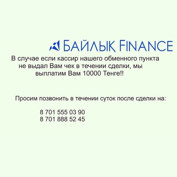 Измерим давление, вес, температуру бесплатно, телефон Аптеки: 573355. Имеются дисконтные карты на покупку медикаментов. Обменные пункты Bailyk Finance угол Кенесары — Республики, работаем круглосуточно, Call Centre 575100,Аптека Доктор+ внутри, Ломбард. We really appreciate Your Feedback! Ответим на всем вопросы! Если Вам что либо не понравилось пожалуйста напишите нам, Baylik Finance v Twitter, Facebook, Vk.