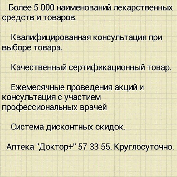 Ежемесячно, бесплатно, в нашей аптеке проводятся акции, где Вас проконсультируют хорошие врачи. Вся информация по акциям по тел:57 33 55 @ Аптека Доктор плюс