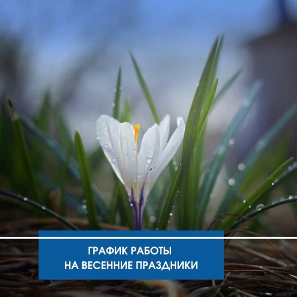 График работы на весенние праздники! Уважаемые клиенты! Поздравляем Вас с первым днём весны! Пусть этот прекрасный сезон принесет вам благополучие и процветание в делах! График работы на праздничные дни в марте: 8 марта – выходной день; 9 марта – работает дежурная смена с 10.00 до 14.00; 10 марта – выходной день. 21, 22, 24 и 25 марта — выходной день; 23 марта — работает дежурная смена с 10.00 до 14.00.