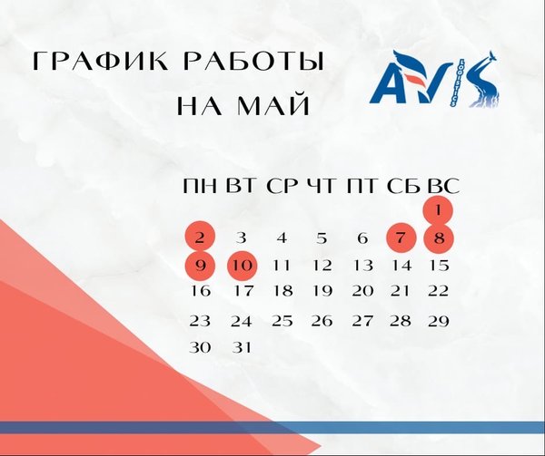 ️ГРАФИК РАБОТЫ НА МАЙСКИЕ ПРАЗДНИКИ Дорогие клиенты! Уведомляем вас о нашем рабочем графике на май. В честь праздников: ️1 Мая — День единства народа Казахстана ️7 Мая — День защитника Отечества Казахстана ️9 Мая — День Победы График работы: 1 мая — выходной день 2 мая — 5 мая — рабочие дни 6 мая — работает дежурная смена с 10:00 до 14:00 7 мая — 9 мая — выходные дни с 10 мая — компания работает в обычном режиме. Всегда Ваш, Avis Logistics