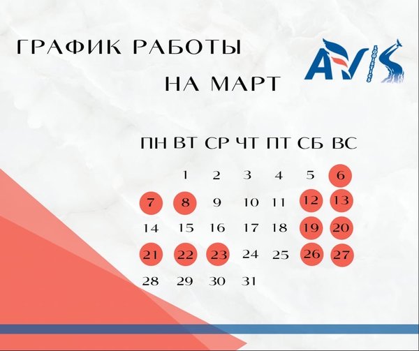 ️ВЕСНА ️ В марте этого года работаем по следующему графику: В честь 8 Марта: 5 марта полный рабочий день; 6, 7 и 8 марта — выходные дни. На Наурыз: 19 марта — будет работать дежурная смена с 10:00 до 14:00. 20, 21, 22 и 23 марта — выходние дни. Всегда Ваш, Avis Logistics