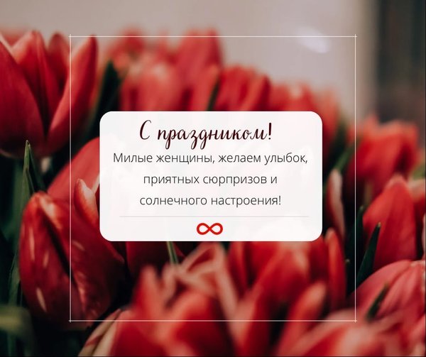 С 8 МАРТА! Наши милые дамы, замечательные клиенты, поздравляем вас с 8 Марта! Пусть этой весной вас ожидает невероятное счастье в жизни и ошеломляющий успех, пусть на пути у таких прекрасных женщин не будет препятствий для достижения целей и воплощения в реальность желаний. Желаем вам жить с радостью в душе, с любовью в сердце и с неотразимой красотой снаружи и внутри! В честь праздника: 8 марта — выходной день Всегда Ваш, Avis Logistics
