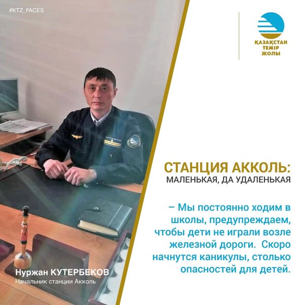 Нуржан Кутербеков начал работу на железной дороге станционным рабочим в 2003 году на станции Кокшетау. На этой станции и остался работать 16 лет, став позже сигналистом, потом – регулировщиком скорости движения вагонов, составителем поездов, дежурным по сортировочной горке, маневровым диспетчером. В марте текущего года Нуржана пригласили на ответственную должность – он стал начальником станции Акколь, в 100 километрах от столицы.