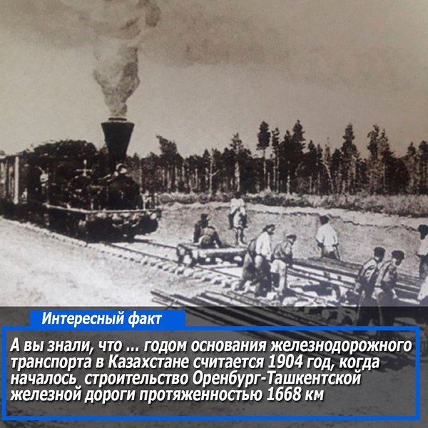 А вы знали, что годом основания железнодорожного транспорта в Казахстане считается 1904 год, когда началось строительство Оренбург-Ташкентской железной дороги протяженностью 1668 км.