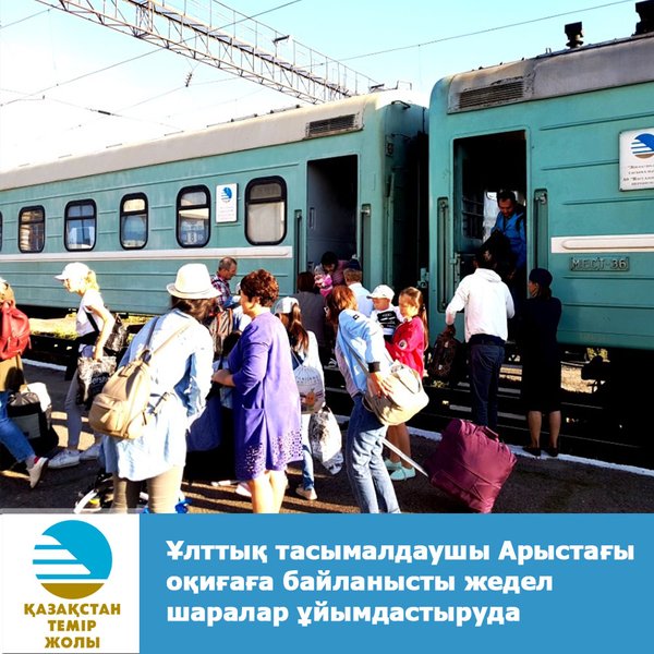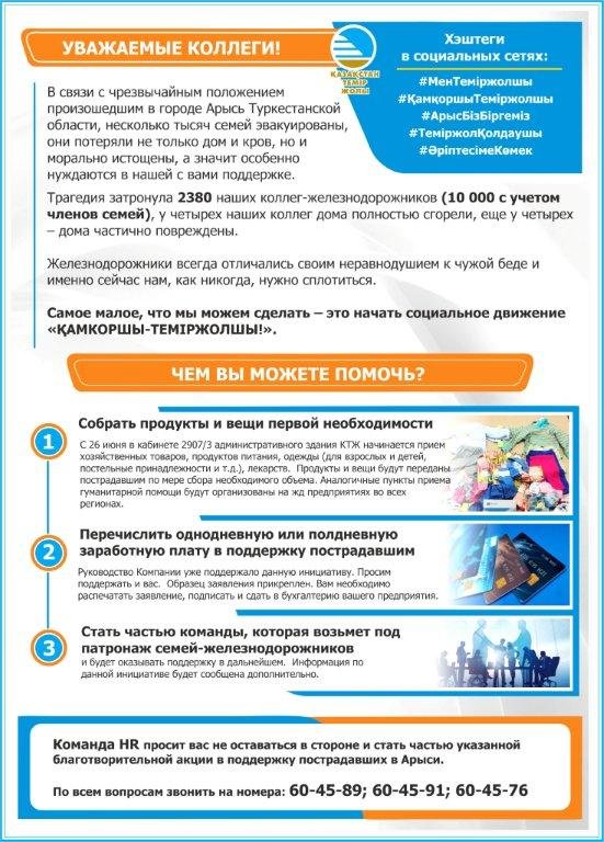 Қазақстан темір жолы» ҰК» АҚ-да «Қамқоршы – теміржолшы!», «Мен — теміржолшы» «Арыс - біз біргеміз», «Темір жол қолдаушы. Әріптесіме көмек» атты әлеуметтік қозғалыстары іске қосылды. Аталған акция шеңберінде Арыстағы төтенше жағдайдан зардап шеккендерге көмек көрсетілмек. Теміржолшылар болған жағдайды жан күйзелісімен қабылдап, сонда зардап шеккен әріптестеріне шынайы жанашырлығын білдіреді.