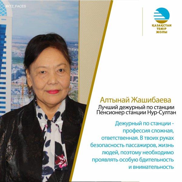 жника. Отец работал проводником. Семья встречала его с работы. Он ходил в темно-синей форме проводника, потянутый и уверенный, всем своим видом демонстрируя, что работать на железной дороге – почетно. Поэтому Алтынай решила еще в детстве связать свое будущее со стальной магистралью. Первое знакомство с железнодорожным транспортом произошло на Целиноградской детской железной дороге, где она подростком изучала азы профессии кассира. А свой взрослый трудовой путь начинала списчиком вагонов станции Целиноград. Более 10 лет работала дежурным по станции, 20 лет инженером по охране труда и возглавляла сложный участок станции – производственно-технический отдел. «Дежурный по станции — профессия сложная, ответственная. В твоих руках безопасность пассажиров, жизнь людей, поэтому необходимо проявлять особую бдительность и внимательность», — говорит она. По ее инициативе на станции в районе сортировочной горки установили пешеходный мост через железнодорожные пути, что в значительной степени снизило травматизм и риск гибели людей на этом участке. В должности начальника отдела руководила процессом внедрения автоматизированной системы управления документами, разработкой технологических карт и инструкций, регламентирующих станционную работу. За долгие годы награждена почетными грамотами, благодарственными письмами и нагрудным знаком «Адал еңбегі үшін». — Станция для меня – мой родной дом, она стала главной в моей жизни. Здесь я была счастлива, встретила хороших, доброжелательных людей. Я на работу шла, как на праздник. И сейчас мы не теряем связь с коллективом, — говорит Алтынай Абдуловна. – Сегодня я вижу, что станция не стоит на месте, она активно развивается. Желаю родному и сплоченному коллективу больших успехов, процветания, достойно продолжать традиции нашего поколения.